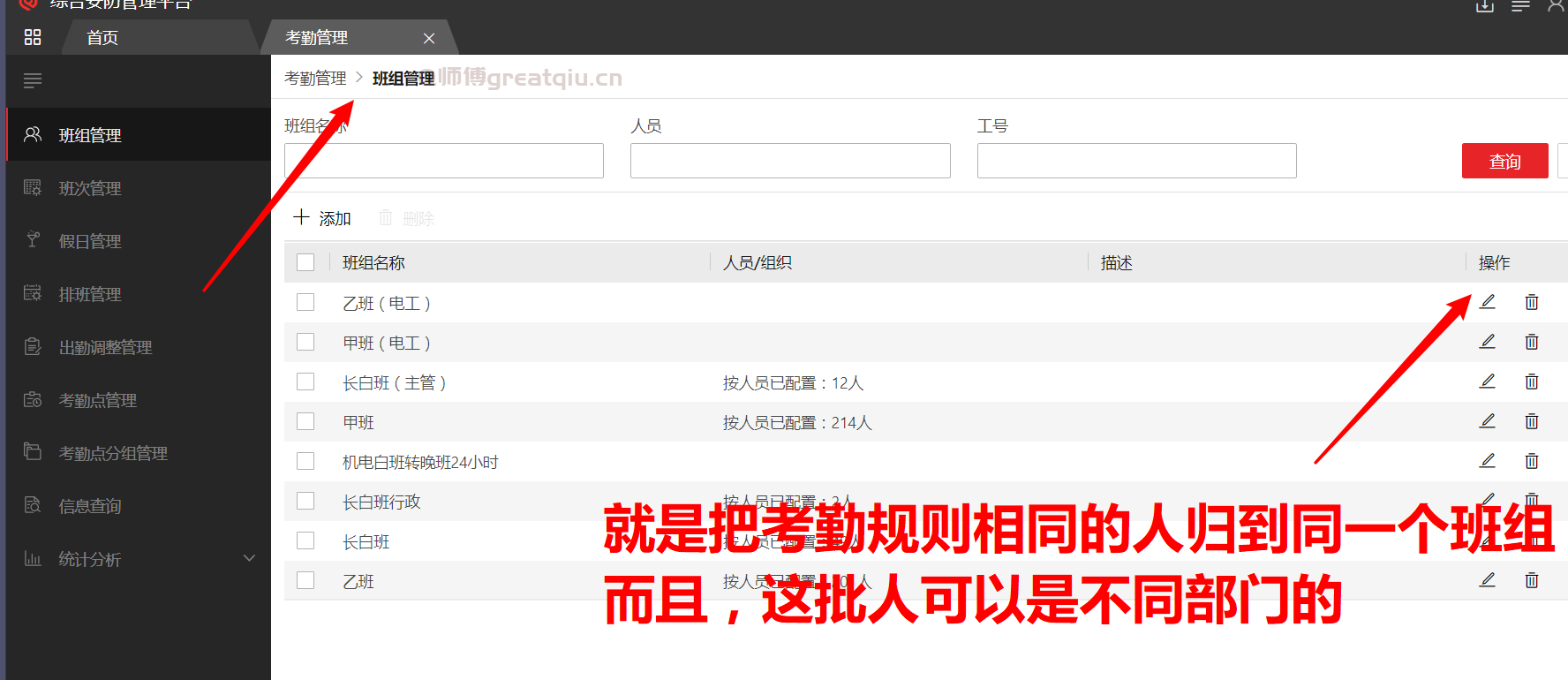 2、设置班组管理:根据考勤人员出勤特点归类班组